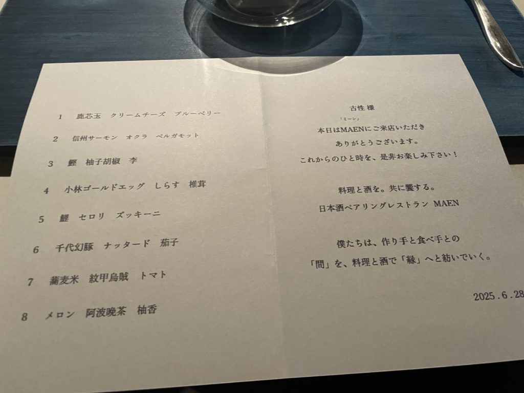またまた日にちが経ってからで恐縮ですが、6/28に恵比寿の日本酒とフレンチのペアリングレストラン「MAEN Sake pairing restaurant」さんに単身乗り込んできた話をまとめます。