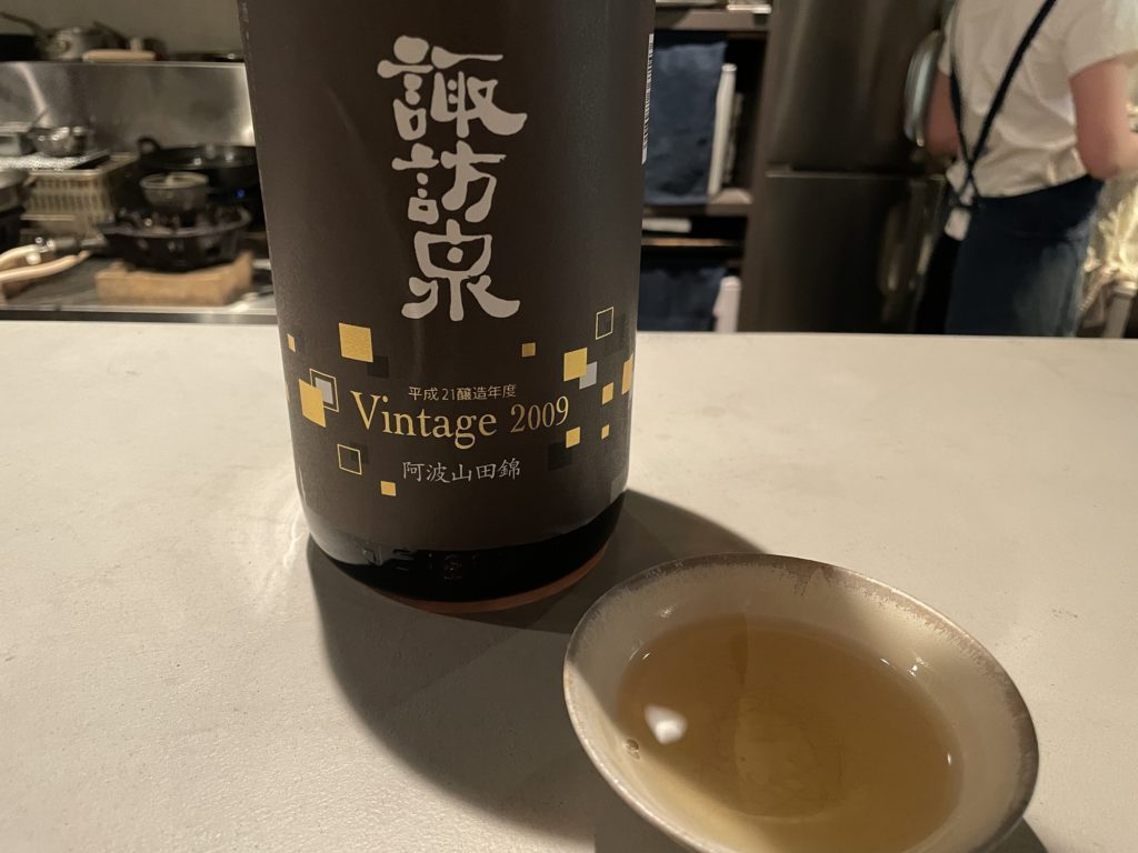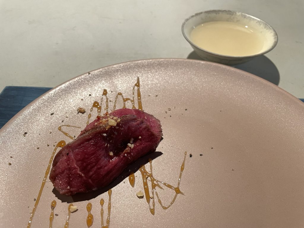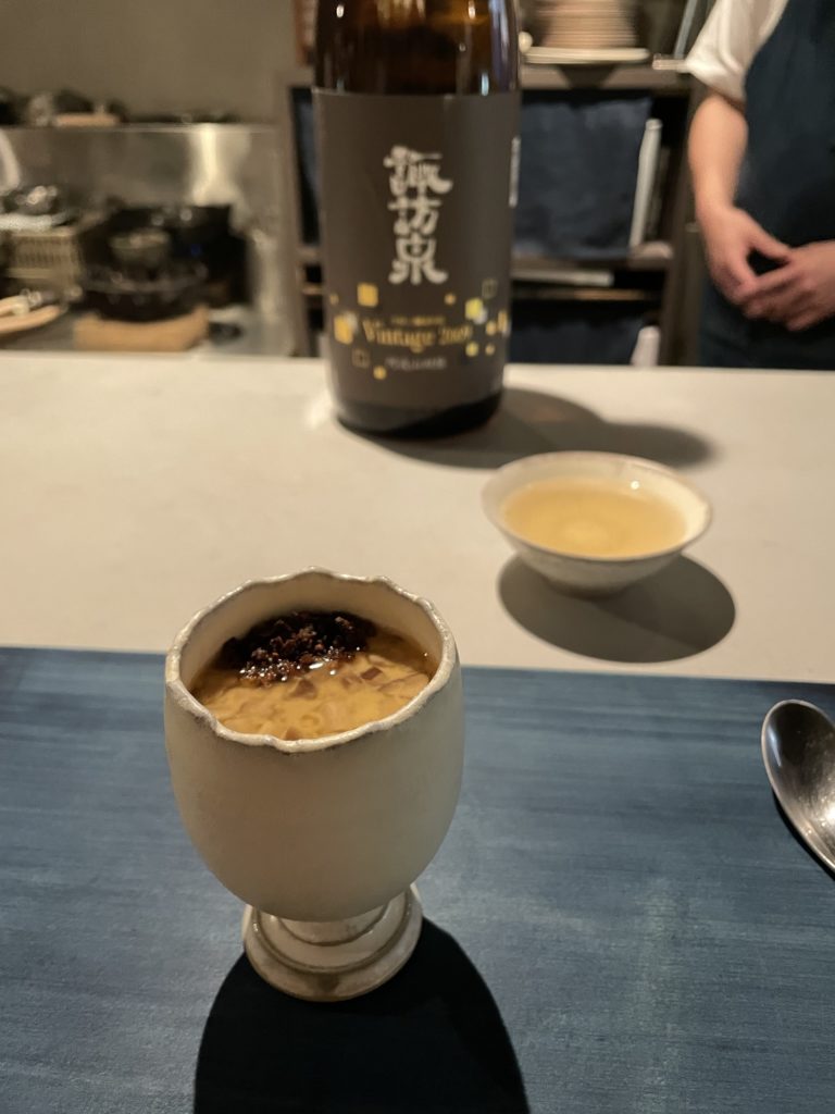 4番目、まさかの洋風茶碗蒸しと諏訪泉の古酒を熱燗したやつのペアリングがクライマックスでした。諏訪泉の熟成酒、酸味が少なくて丸いんすよ。