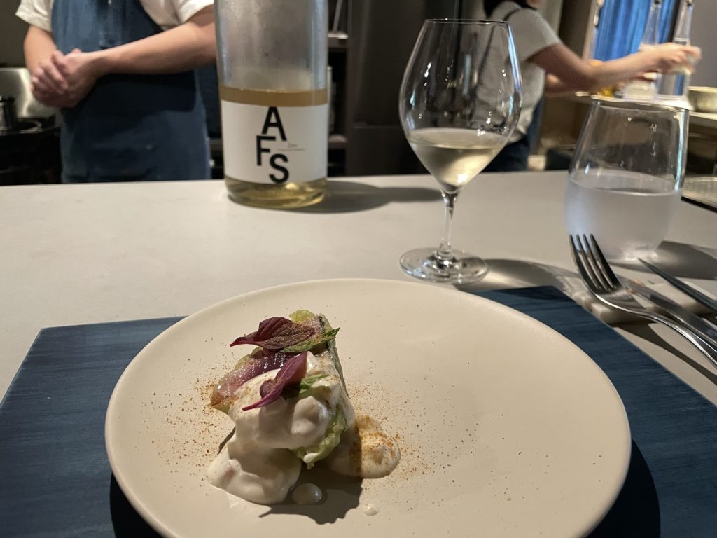 讃岐くらうでぃと鹿肉の組み合わせから始まり、千葉のAFSと鰹のお料理など、最初は酸味で合わせていくタイプ。お酒は個性的ですけど、有りだなって感じのペアリングで、進んでいきます。