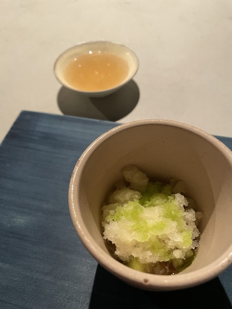 その後は、南部美人を熱燗して出汁で割ったやつとか(!?)、大七(だと思う)にチーズを溶かしたやつとリゾットの組み合わせとか。すごいの出てきてビックリです。ここまでくると、ペアリングっていうか、スープですね。料理の一部。